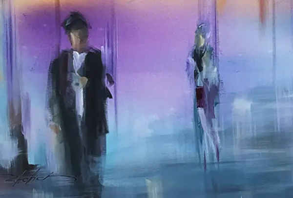 Hettich setzt Silhouetten, Licht, Raum und Glasmalerei meisterhaft ein. Daraus entsteht eine faszinierende Harmonie. Das Gemälde zeigt nicht nur die Ästhetik eines weiten, großzügigen Raumes. Es spiegelt zugleich die Stimmung und den Glanz einer pulsierenden Stadt wider.